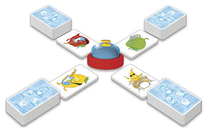 - Sobald auf allen offenen Ablagestapeln zwei Karten zu sehen sind, bei denen mindestens zwei der drei Eigenschaften übereinstimmen, müssen alle Spieler so schnell wie möglich auf die Glocke hauen.