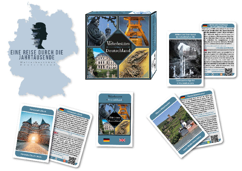 Für jede Welterbestätte gibt es eine eigene Spielkarte. Faszinierende Fotos visualisieren diese außergewöhnlichen Orte. Kurzweilige Beschreibungen in Deutsch und Englisch vermitteln prägnant viel Interessantes und Wissenswertes. Knifflige Quizfragen bringen Spielspaß für die ganze Familie. Und schließlich gibt es zu jeder Welterbestätte einen QR-Code, der ganz einfach mit dem Handy eingescannt werden kann und auf weiterführende Informationen verlinkt.