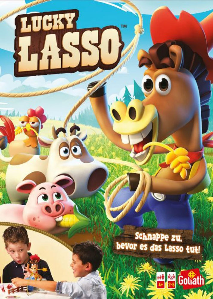Wer schnappt sich die meisten Tiere und entwischt dem schnellen Lasso von Lucky? Mit dem Reaktionsspiel „Lucky Lasso“ von Goliath geht es um ein gutes Auge und eine schnelle Reaktion! Die Aktionsscheibe gibt vor, welche Tiere als nächstes gefangen werden müssen. Zum Fangen der Tiere greifen die Spieler*innen durch das schwingende Lasso. Aber Vorsicht ist geboten, denn falls das Lasso zuschnappt, muss ein ergaunertes Tier zurückgegeben werden. Spielespaß für die ganze Familie.